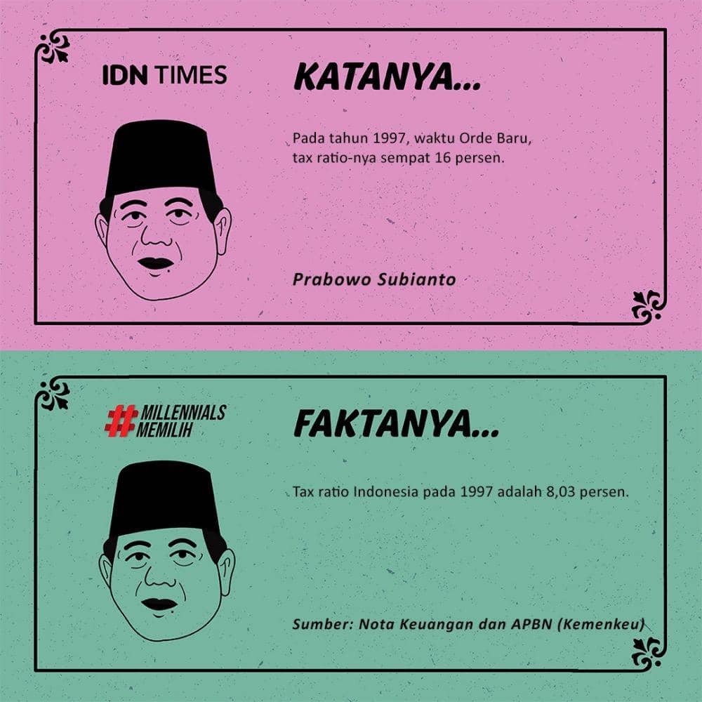 Prabowo mengklaim Indonesia pernah berada di posisi tersebut, tepatnya pada era Orde Baru. "Pada tahun 1997, waktu Orde Baru, tax ratio-nya sempat 16 persen," kata mantan Jenderal Kopassus tersebut.