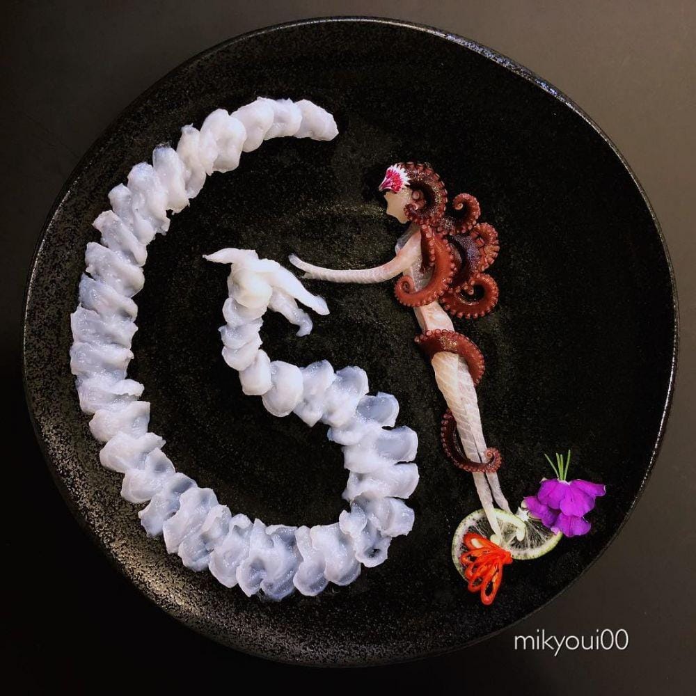 1. Kalau biasanya sashimi art hanya berkisar pada ikan atau burung, ia bisa membuat bentuk yang lebih beragam, seperti karakter wanita