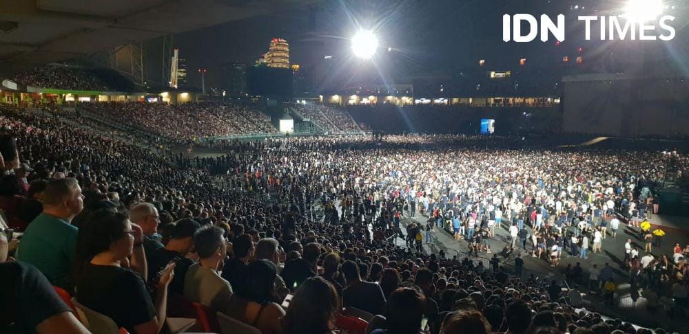 2. Ribuan penonton histeris saat konser band asal Irlandia ini dimulai. Suasana dalam National Stadium, Singapura, pecah banget