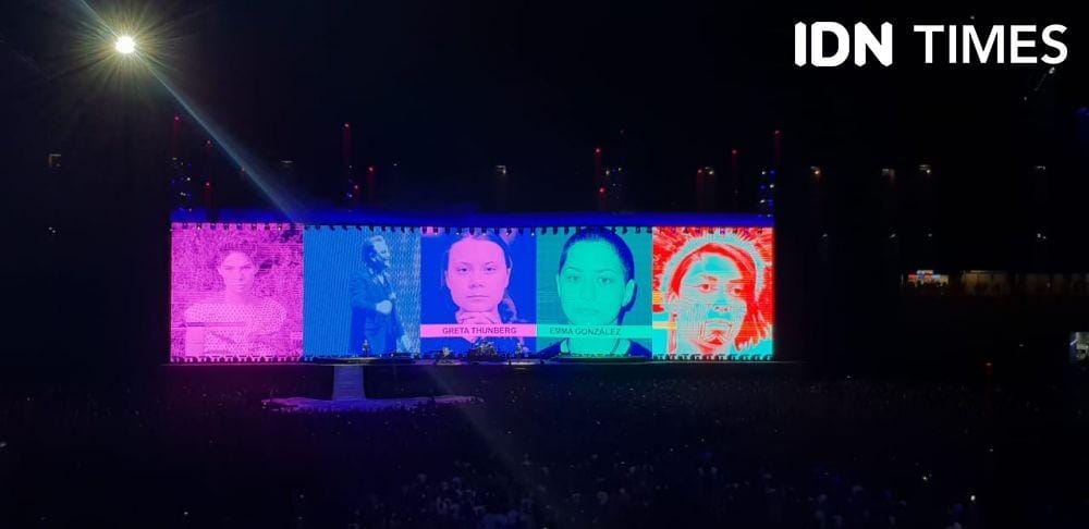 15. Di sela-sela menyanyi, layar panggung U2 menampilkan gambar sejumlah perempuan dari tim pendaki gunung Everest asal Singapura sampai sosok Greta Thunberg juga ada lho