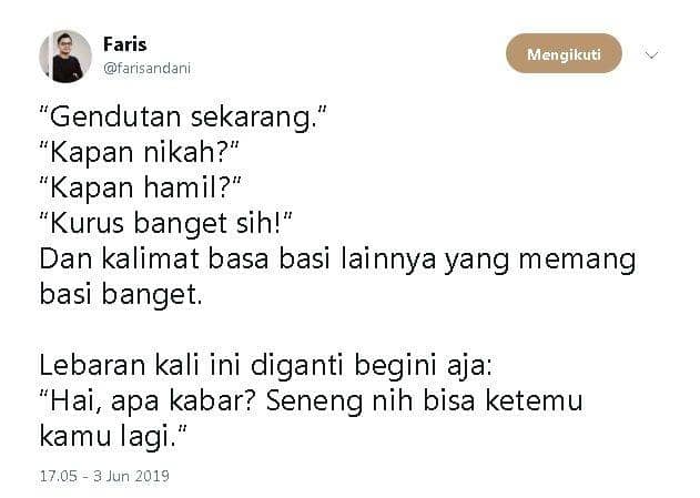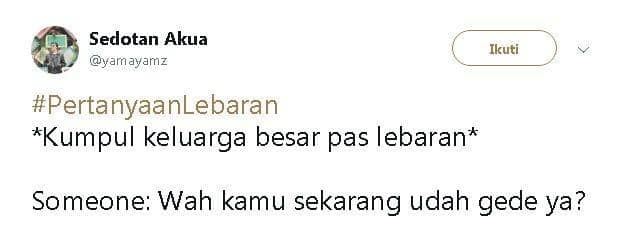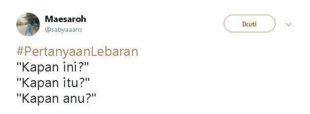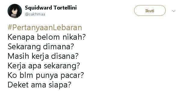 Tenang aja, Lebaran tahun ini, netizen Twitter sudah memprediksi tuh pertanyaan apa saja yang akan ditanyakan saat Lebaran. Jadi, kamu bisa nih mempersiapkan jawabannya dengan hati yang lapang dada, alias sabar, hehe. Keep reading!