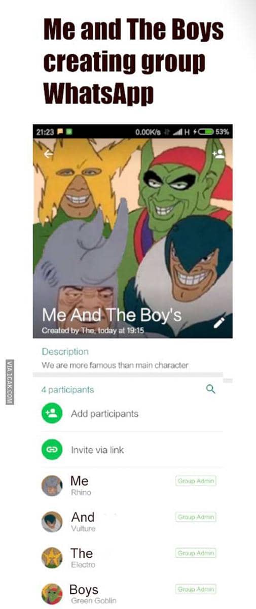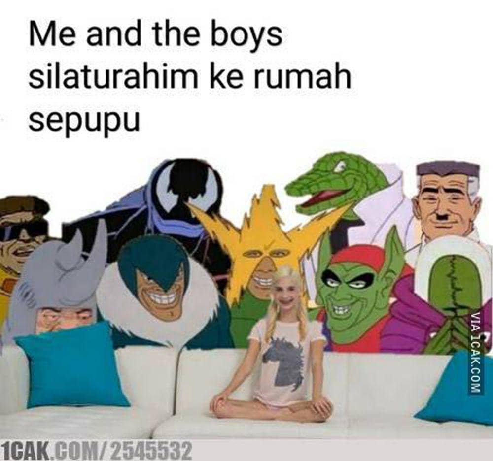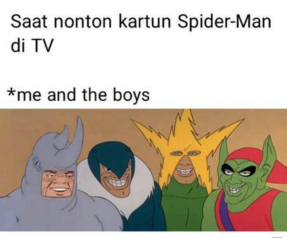 Meme 'me and boys' lagi viral di media sosial. Meme ini diambil dari potongan film animasi Spiderman pada tahun 60an, yang mana berisi para penjahat ikonik seperti Vulture, Elektro, dan Green Goblin, serta Rhino yang telah diedit.