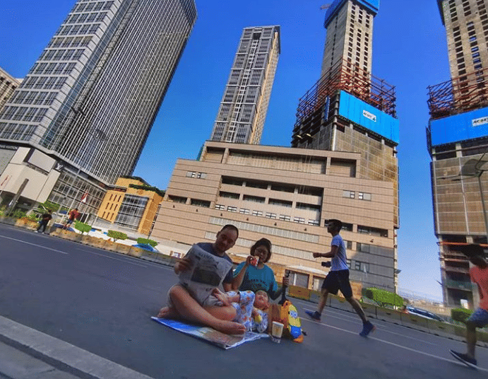 10. Piknik keluarga, bersantai di depan gedung tinggi