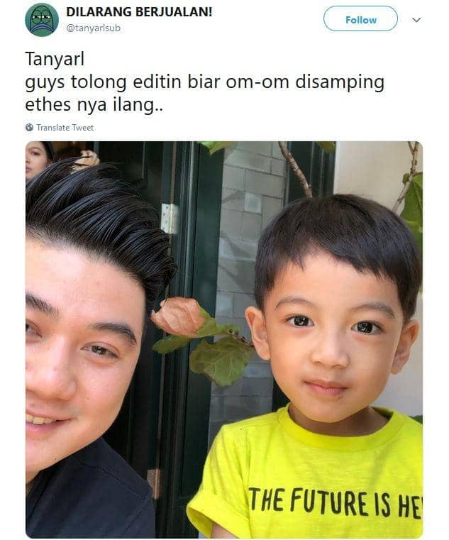 Lagi-lagi netizen perang kreativitas nih. Salah seorang pengguna Twitter mengajukan request agar foto Jan Ethes dan Chef Arnold Poernomo diedit. Tujuannya biar hanya cucu Jokowi saja yang ada dalam gambar tersebut.