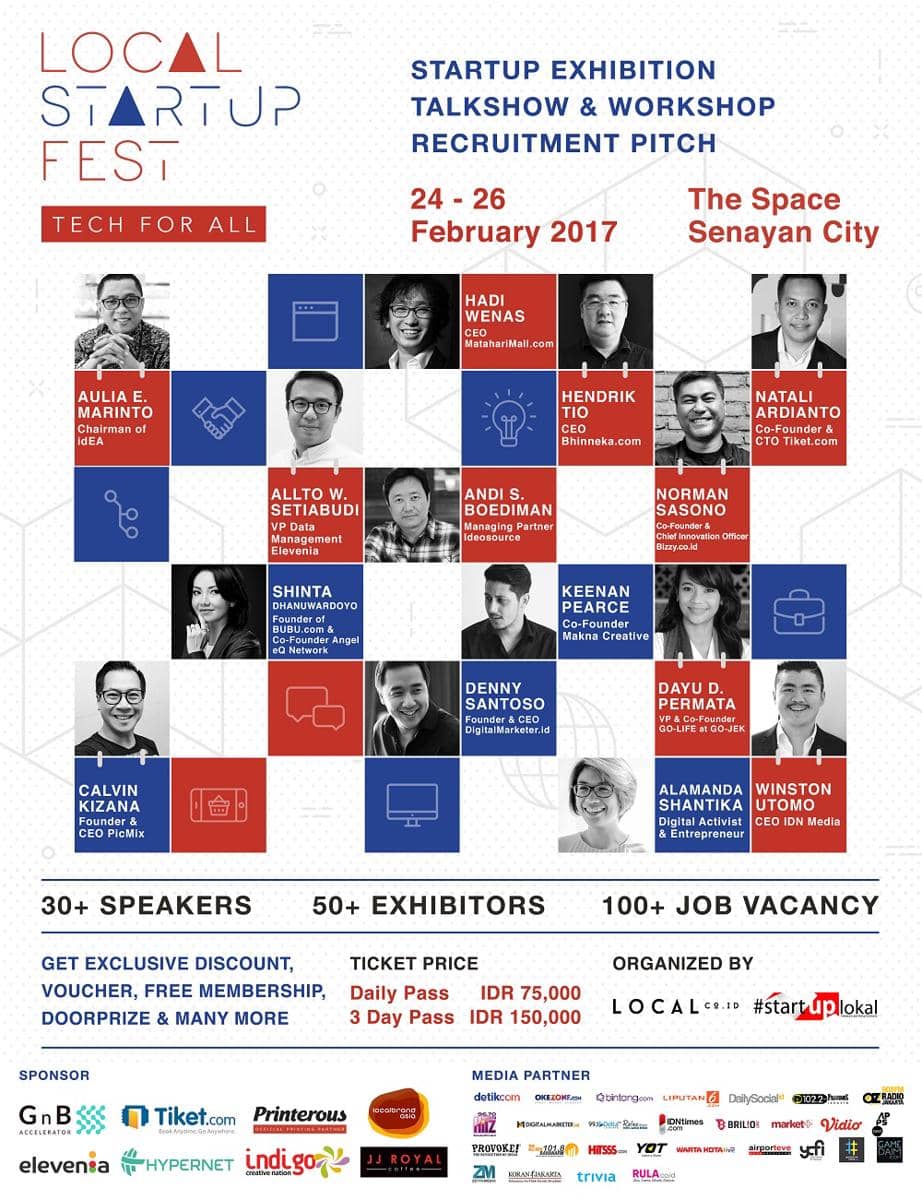 Acara yang diselenggarakan di The Space Senayan City ini nantinya akan menghadirkan lebih dari 30 pembicara ternama di bidang indsutri startup. Beberapa pembicara tersebut diantaranya Hadi Wenas CEO MatahariMall.com, Natali Ardianto Co-Founder & CTO Tiket.com, Aulia Ersyah Marinto Chairman of idEA & CEO Blanja.com dan masih banyak lainnya. Acara ini akan diadakan pada 24-26 Februari 2017.