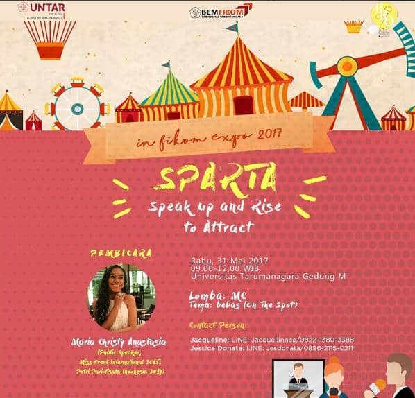 - Bidang Public Relations “SPARTA (Speak Up and Rise to Attract)” akan menghadirkan Maria Christy Anastasia, Miss Event International & Putri Pariwisata.