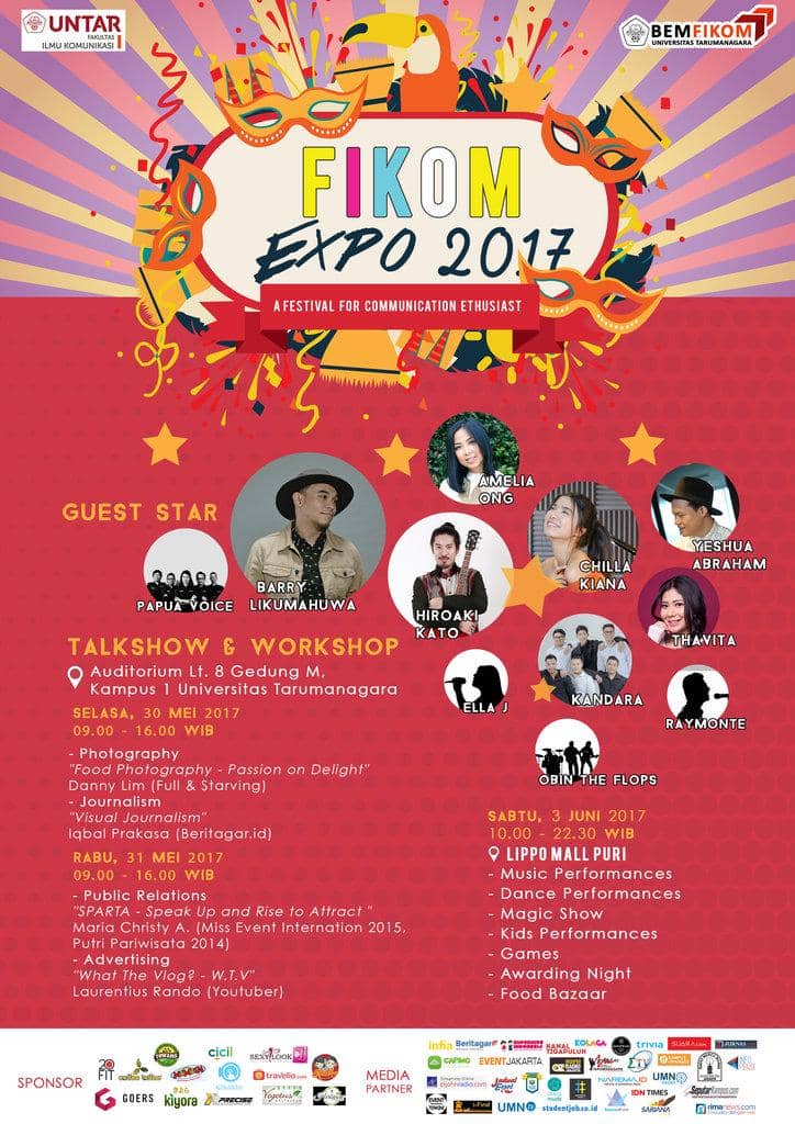 Passion dalam bidang komunikasi atau ingin terjun ke media industri? Dan ingin tahu lebih banyak tentang Public Relations, Jurnalistik, Periklanan, dan Fotografi? Buat kamu yang berada di sekitar Jakarta Barat, BEM FIKom Universitas Tarumanagara akan kembali mempersembahkan sebuah pagelaran komunikasi tahunan terbesar di Untar, yaitu FIKOM EXPO 2017. Pagelaran ini akan tampil dengan gaya yang menarik, dengan tujuan untuk memberikan edukasi serta mengasah passion mereka yang ingin terjun di industri media komunikasi, khususnya dalam bidang Public Relations, Jurnalistik, Periklanan, dan Fotografi.