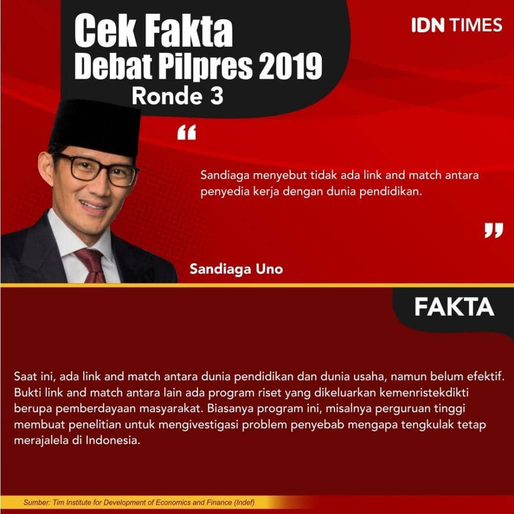 Jakarta, IDN Times - Calon Wakil Presiden nomor urut 02 Sandiaga Uno mengatakan tidak ada link and match antara penyedia kerja dengan dunia pendidikan. Peneliti Institute for Development of Economics and Finance (Indef) Esa Suryaningrum membantah pernyataan Sandiaga.