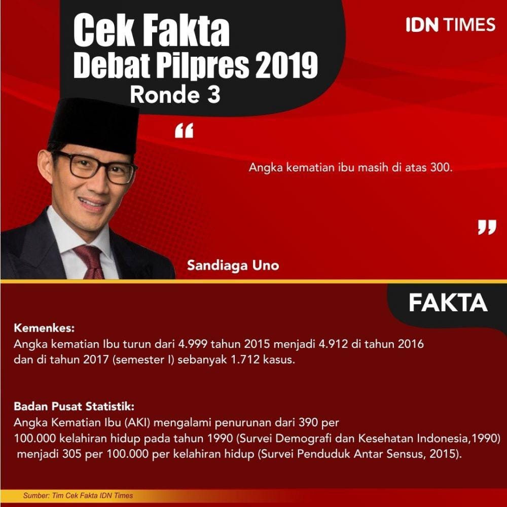 Jakarta, IDN Times - Calon wakil presiden nomor urut 02 Sandiaga Uno mengatakan, angka kematian ibu masih di atas 300. Hal itu diungkapkan dalam debat Pilpres 2019 putaran ketiga, Minggu (17/3) malam.