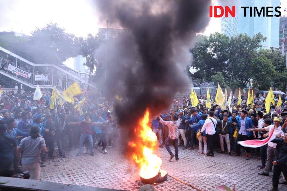 2. Massa mulai membakar ban ketika berunjuk rasa di depan gedung KPK