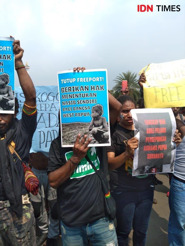 Jakarta, IDN Times - Ratusan pemuda Papua yang tergabung dalam Aliansi Mahasiswa Anti Rasisme, Kapitalisme, Kolonialisme, dan Militerisme menggelar aksi, Kamis (22/8). Aksi berlangsung di seberang Istana Merdeka, Jakarta.
