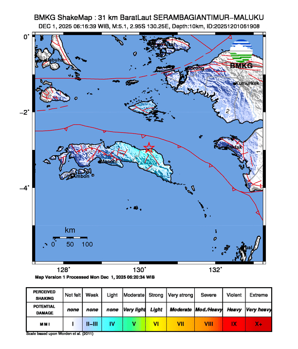 Gempa Hari Ini 01/12/2025 bermagnitudo 5.1 di SERAMBAGIANTIMUR-MALUKU