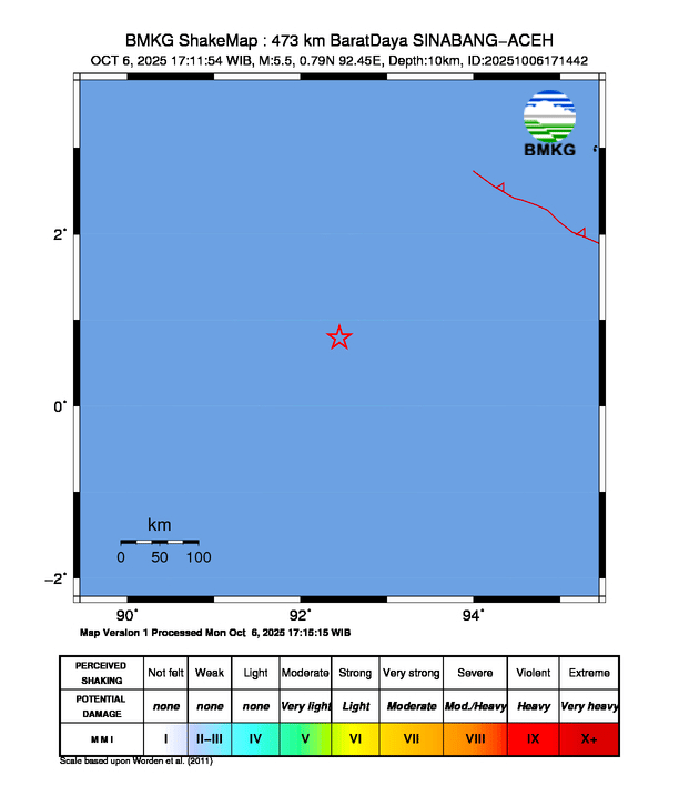 Gempa bumi berkekuatan M 5.5 mengguncang SINABANG-ACEH pada Senin, 06/10/2025 pukul 17:11 WIB. Badan Meteorologi, Klimatologi, dan Geofisika (BMKG) menyatakan tidak berpotensi tsunami