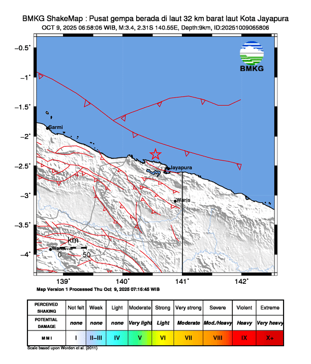 Gempa Hari Ini 09/10/2025 bermagnitudo 3.4 di Jayapura
