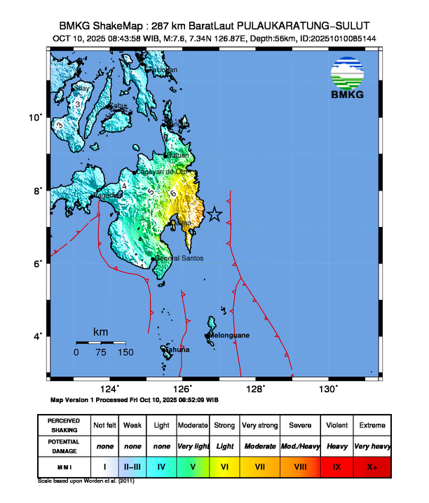 Gempa Hari Ini 10/10/2025 bermagnitudo 7.6 di PULAUKARATUNG-SULUT