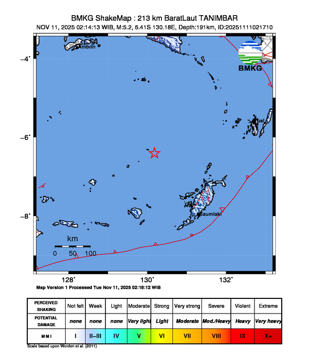 Gempa Hari Ini 11/11/2025 bermagnitudo 5.2 di TANIMBAR