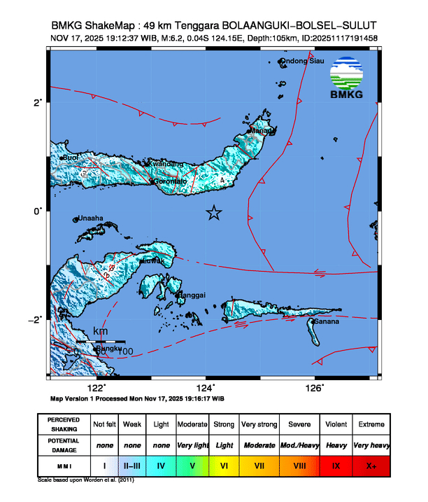 Gempa Hari Ini 17/11/2025 bermagnitudo 6.2 di BOLAANGUKI-BOLSEL-SULUT