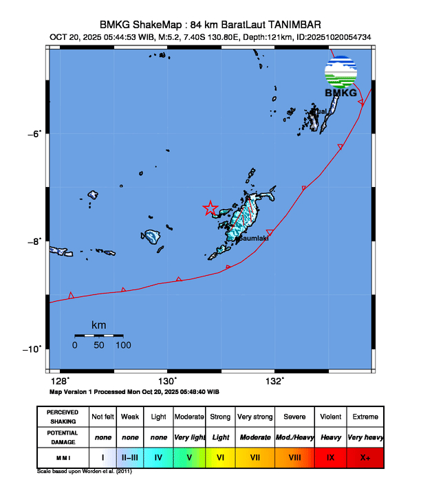 Gempa Hari Ini 20/10/2025 bermagnitudo 5.2 di TANIMBAR