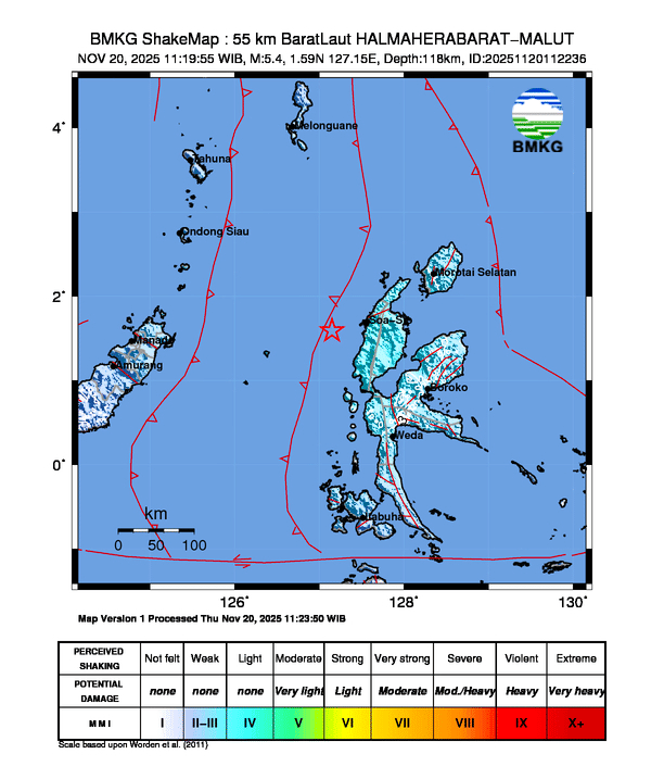 Gempa Hari Ini 20/11/2025 bermagnitudo 5.4 di HALMAHERABARAT-MALUT