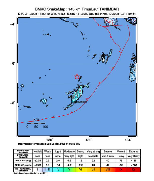 Gempa Hari Ini 21/12/2025 bermagnitudo 5.5 di TANIMBAR