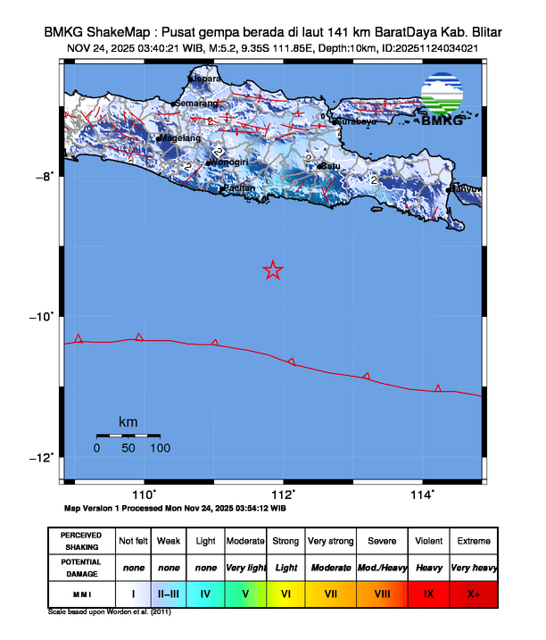 Gempa Hari Ini 24/11/2025 bermagnitudo 5.2 di Kuta