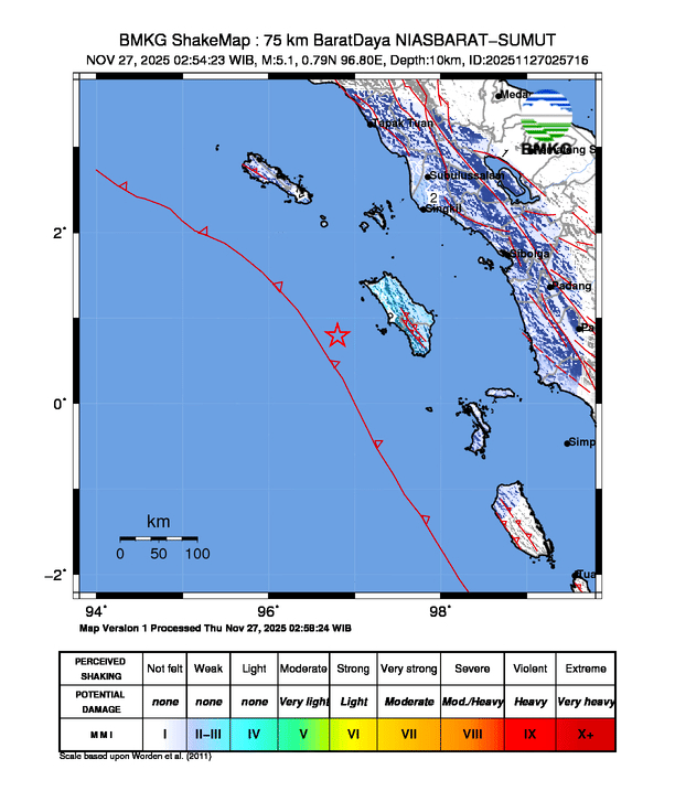Gempa bumi berkekuatan M 5.1 mengguncang NIASBARAT-SUMUT pada Kamis, 27/11/2025 pukul 02:54 WIB. Badan Meteorologi, Klimatologi, dan Geofisika (BMKG) menyatakan tidak berpotensi tsunami