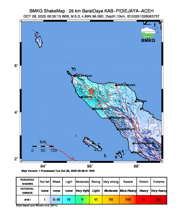 Gempa bumi berkekuatan M 5.3 mengguncang KAB-PIDIEJAYA-ACEH pada Selasa, 28/10/2025 pukul 06:35 WIB. Badan Meteorologi, Klimatologi, dan Geofisika (BMKG) menyatakan tidak berpotensi tsunami