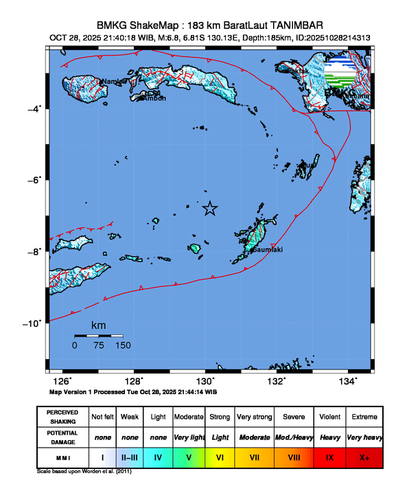 Gempa Hari Ini 28/10/2025 bermagnitudo 6.8 di TANIMBAR