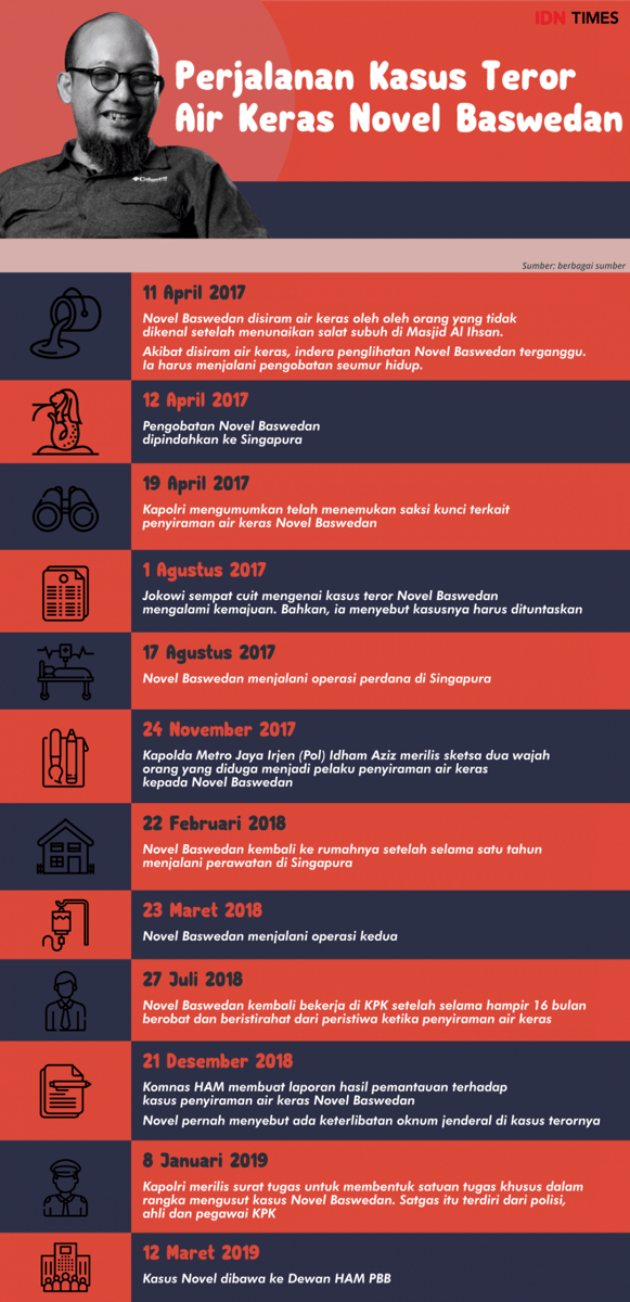 Berikut perjalanan kasus Novel Baswedan sejak ia disiram air keras pada 11 April 2017 hingga perkaranya diperdengarkan ke Dewan HAM PBB.