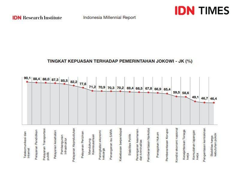 Jakarta, IDN Times - Melalui riset Indonesia Millennial Report (IMR) 2019, IDN Research Institute mengukur sejauh mana kepuasan generasi muda terhadap kinerja Jokowi-JK. Tingkat optimisme untuk satu tahun ke depan tersebut diukur dari kepuasan millennial terhadap kondisi yang sudah berjalan.