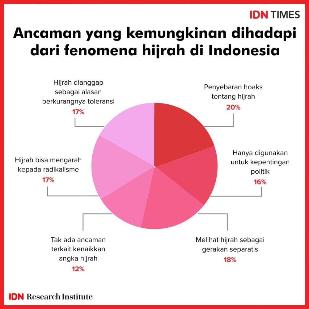 Yang lain mengatakan bahwa hijrah kadang dipandang sebagai gerakan separatis (18 persen), hijrah juga dilihat sebagai gerakan yang mengarah ke radikalisme (17 persen), dan hijrah bisa menjadi salah satu alasan untuk mengurangi tingkat toleransi dalam masyarakat (17 persen).