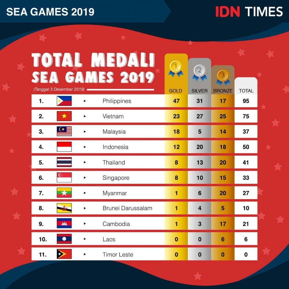 Jakarta, IDN Times - Indonesia masih belum beranjak dari posisi empat perolehan medali SEA Games 2019. Total, Indonesia sudah mengumpulkan 50 medali, dengan rincian 12 emas, 20 perak, dan 18 perunggu hingga Rabu (4/12) pukul 06.00 WIB.