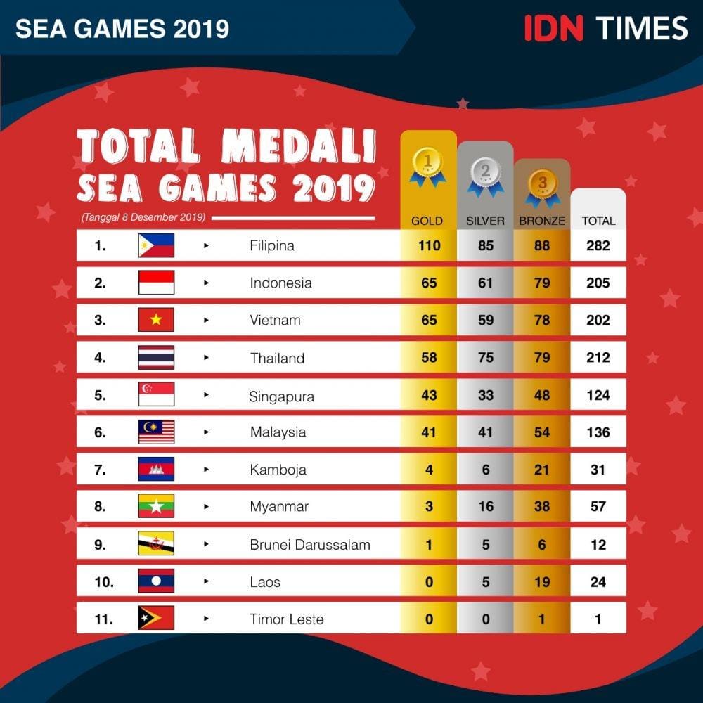 Sedangkan, sang pemuncak klasemen medali SEA Games sementara, Filipina semakin sulit dikejar dengan torehan 110 emas, 85 perak, dan 88 perunggu dengan total 282 medali yang sudah dikumpulkan jelang berakhirnya SEA GAmes.