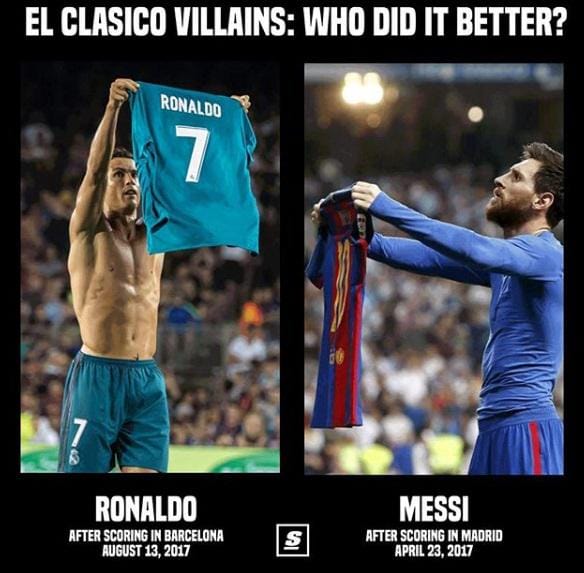 Selebrasi itu sekaligus bertujuan untuk mengolok-olok Messi yang melakukan hal serupa saat Madrid bersua Barca di Santiago Bernabeu beberapa waktu lalu. Apesnya, hanya 3 menit setelahnya, Ronaldo harus diusir keluar setelah mendapat kartu kuning kedua akibat tindakan diving di kotak penalti Blaugrana.